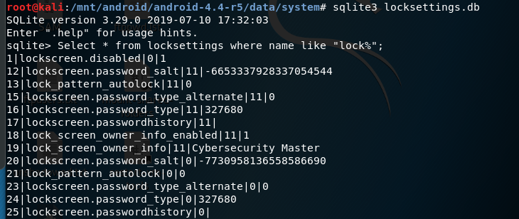 To extract the salt from the database you can use the following SQLite statement: “SELECT value FROM locksettings WHERE name=’lockscreen.password_salt'”