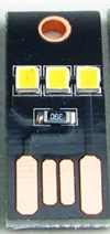 Two outside pins are for GND (left below) and 5V (right below). I had to solder leads onto the pins. Note, 3 volts also works but less than half as bright.