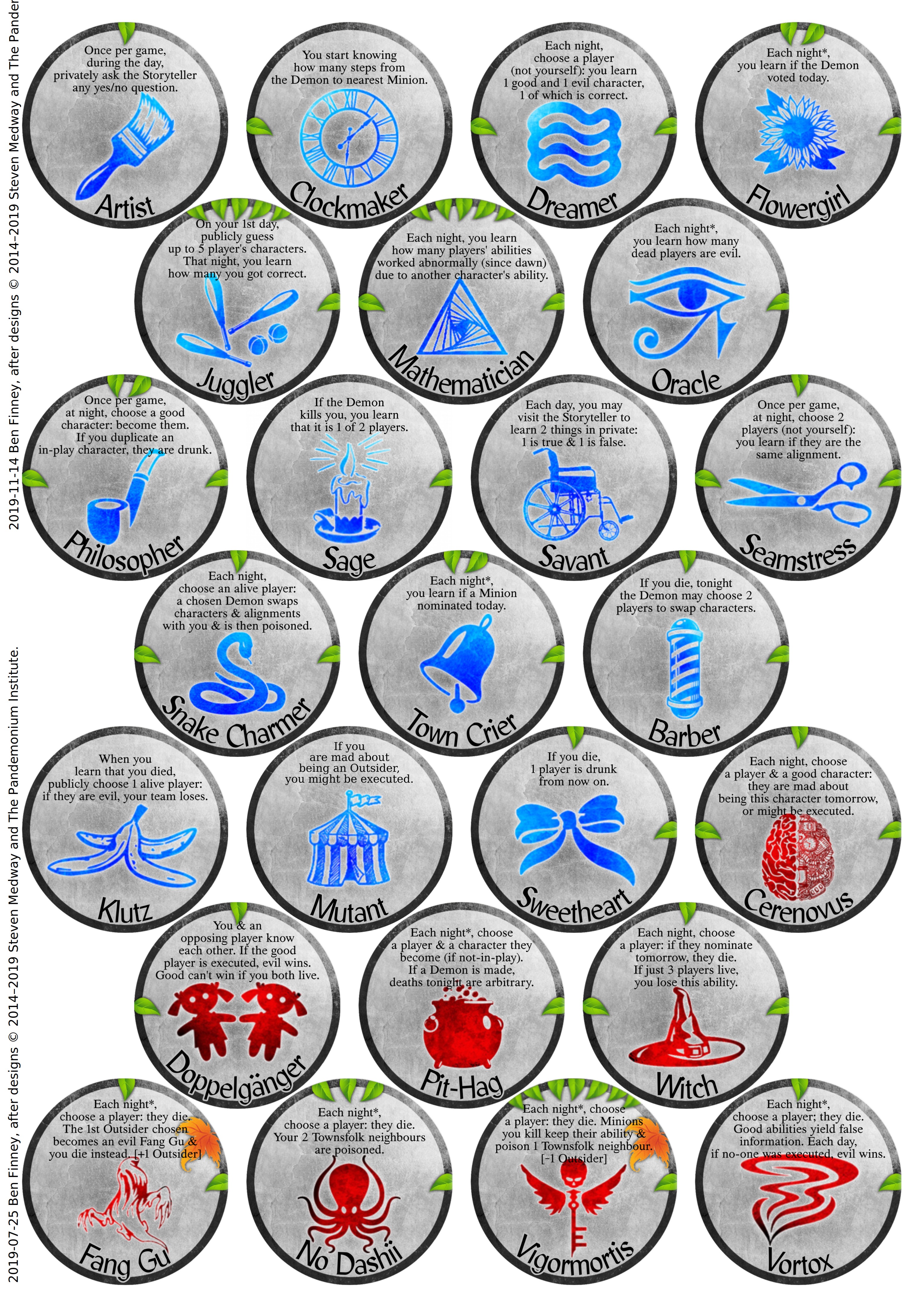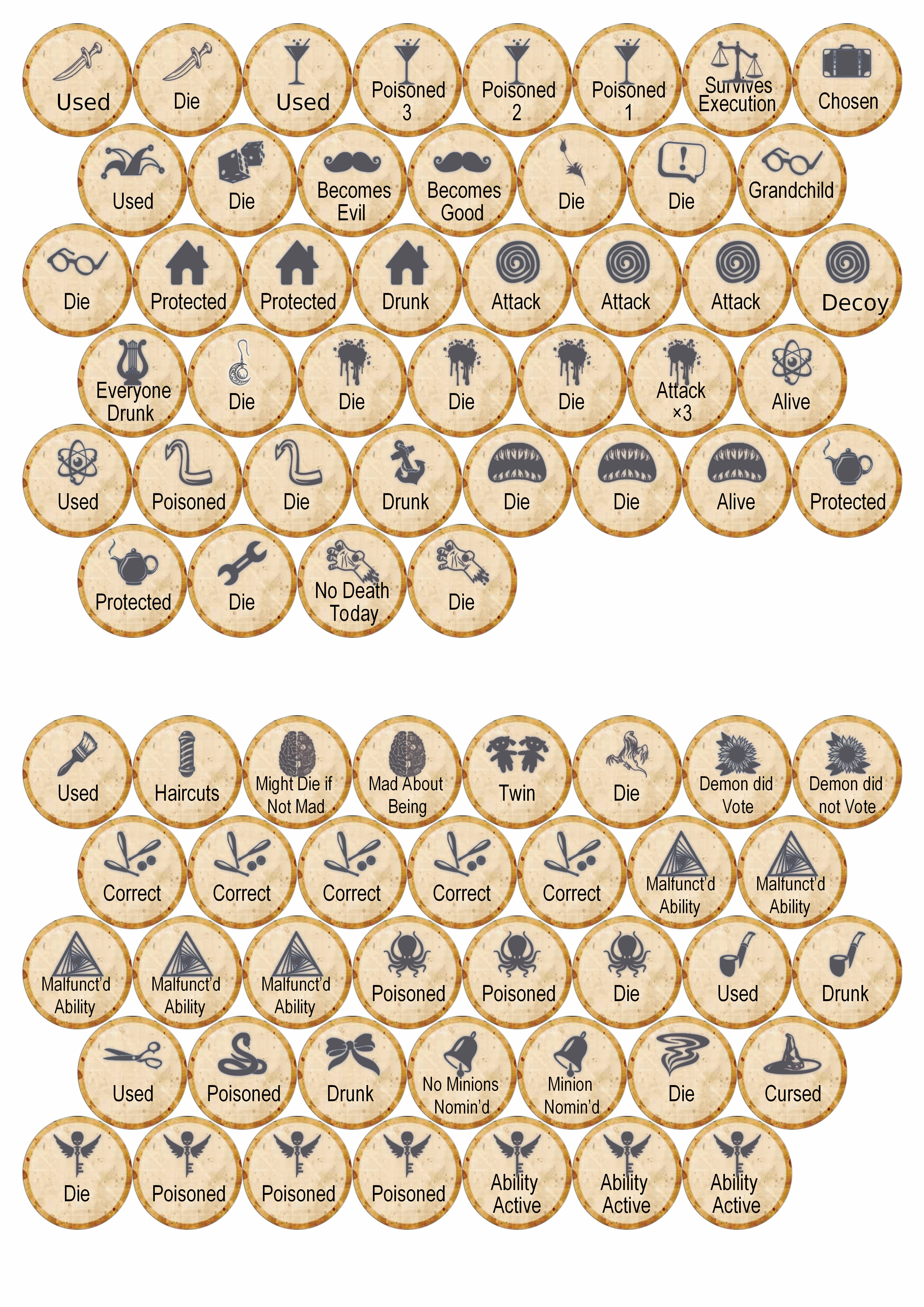 25 Character Tokens - 13 Good Townsfolk, 4 Good Outsiders, 4 Evil Minions & 4 Evil Demons