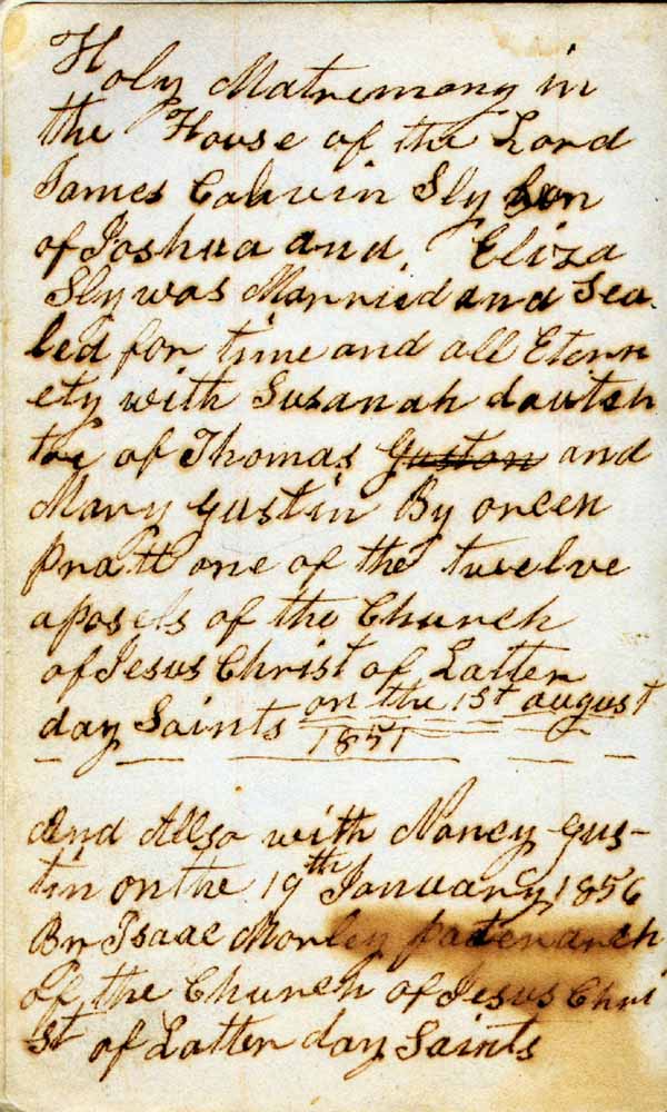 Holy Matrimony in the House of the Lord James Calvin Sly Son of Joshua and Eliza Sly was Married and sealed for time and all Eternity with Susannah daughter of Thomas and Mary Gustin by Orcen Pratt one of the twelve apostles of the Church of Jesus Christ of Latter-day Saints, on the 1st August 1851