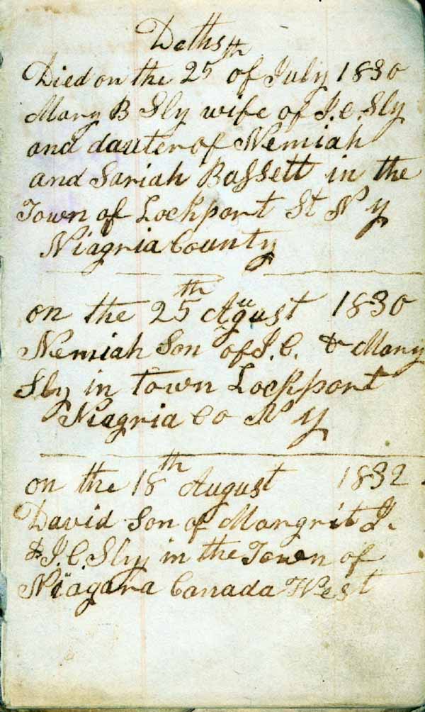 Died on the 25th of July 1830: Mary B Sly wife of J C Sly and daughter of Nemiah and Sariah Bassett in the town of Lockport St NY, Niagara County