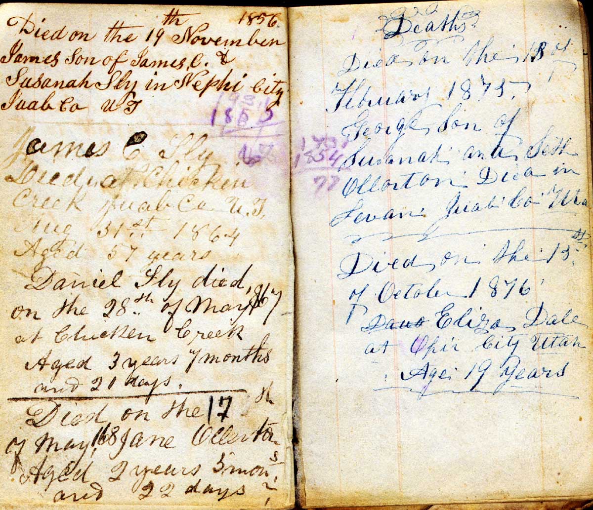 Died on the 19th November 1856 James son of James C and Susannah Sly in Nephi City Juab Co. UT James C. Sly died at Chicken Creek, Juab Co, UT Aug 31st 1864 Aged 57 years. Daniel Sly died on the 28th of May 1867 at Chicken Creek Aged 3 years 7 months and 21 days Died on the 17th of May 1868 Jane Ollerton Aged 2 years 5 months and 22 days |
