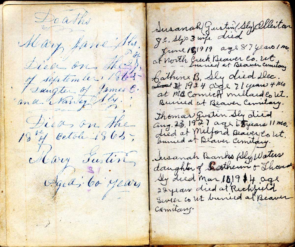 Susannah Gustin (Sly) Ollerton J. C. Sly's 3rd wife died June 18, 1919 age 87 years 1 month. At North Creek Beaver Co. UT --- Buried at Beaver Cemetery