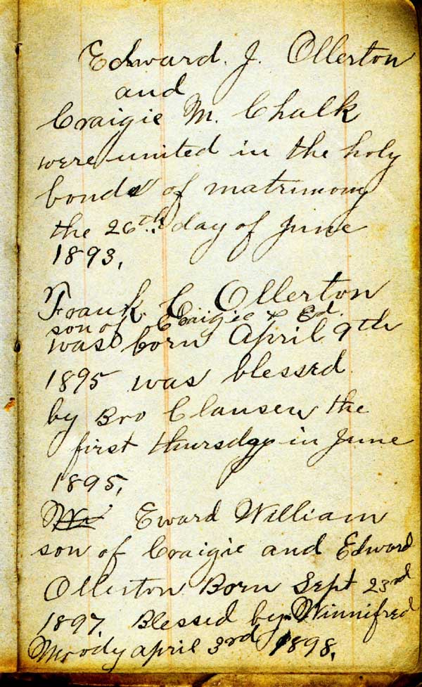 Frank C. Ollerton son of Craigie & Ed. Was born April 9th 1895, was blessed by Bro. Clausen the first Thursday in June 1895,