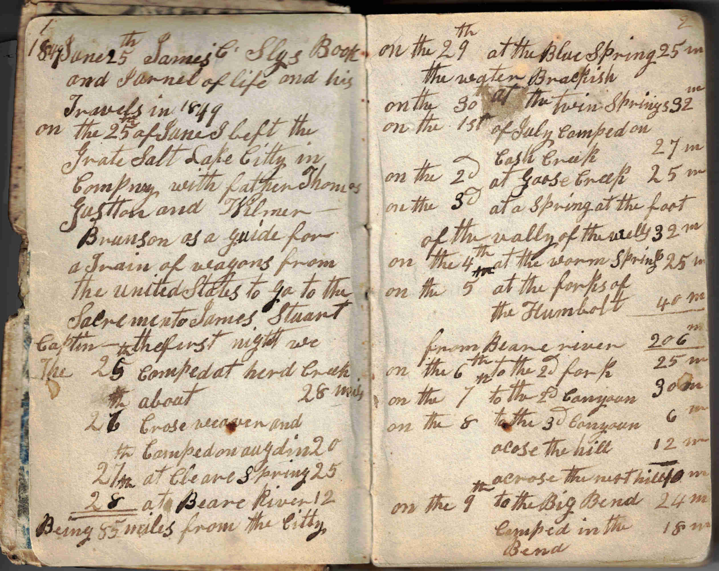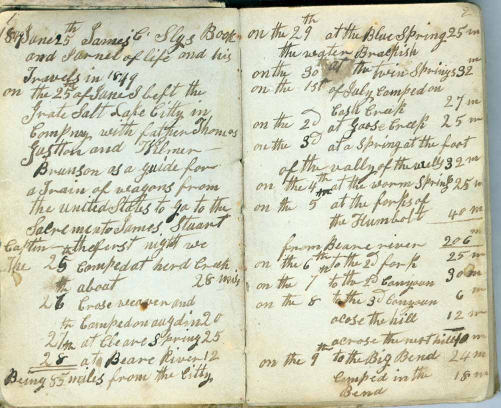 Page 11849 June 25th James C. Sly's Book and [Journal] of life and his travels in 1849 On the 25th of June I left the [Great] Salt Lake [City] in Company with father Thomas [Gustin] and Wilmer Brunson as a guide for a Train of wagons from the United States to go to the [Sacramento]. James Stuart The Captain The first night the we The 25th camped at herd Creek, about 28 miles 26th [Cross] weaver and Camped on [Ogden] 20 miles 27th at [Clear] Spring 25 miles 28th at [Bear] River 12 miles Being 85 files from [Salt Lake City]