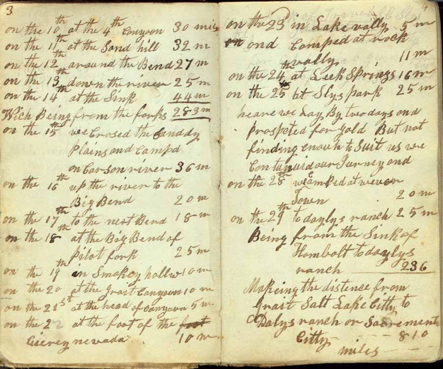 Page 4On the 23rd in Lake Valley 5 miles and camped at Rock valley 11 miles On the 24th at Leek Springs 16 miles On the 25th at Sly's Park 25 miles Here we lay by two days and prospected for gold. But not finding enough to suit us we Continued our Journey and On the 28th we camped at Weuon town 20 miles On the 29th to Daylys ranch 25 miles Being from the sink of Humbolt to Daylys ranch 236 miles Making the distance fromGreat Salt Lake City to Daylys ranch on SacramentoCity 810 miles