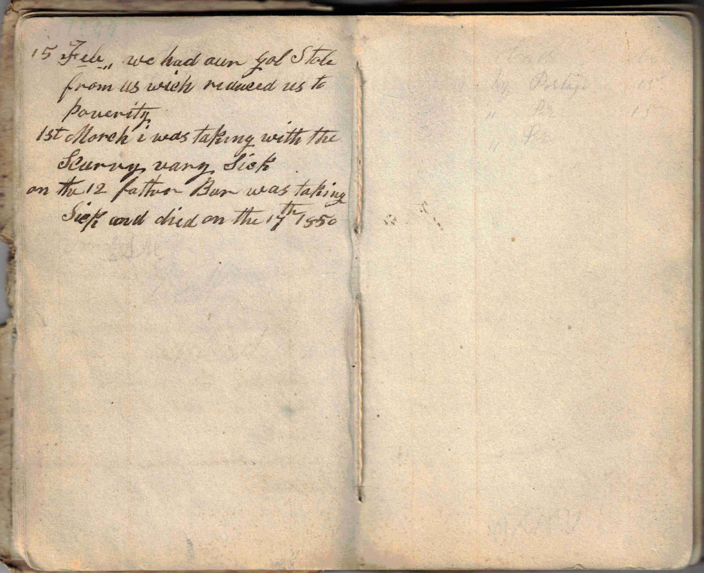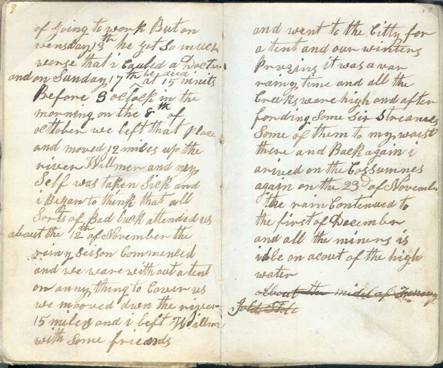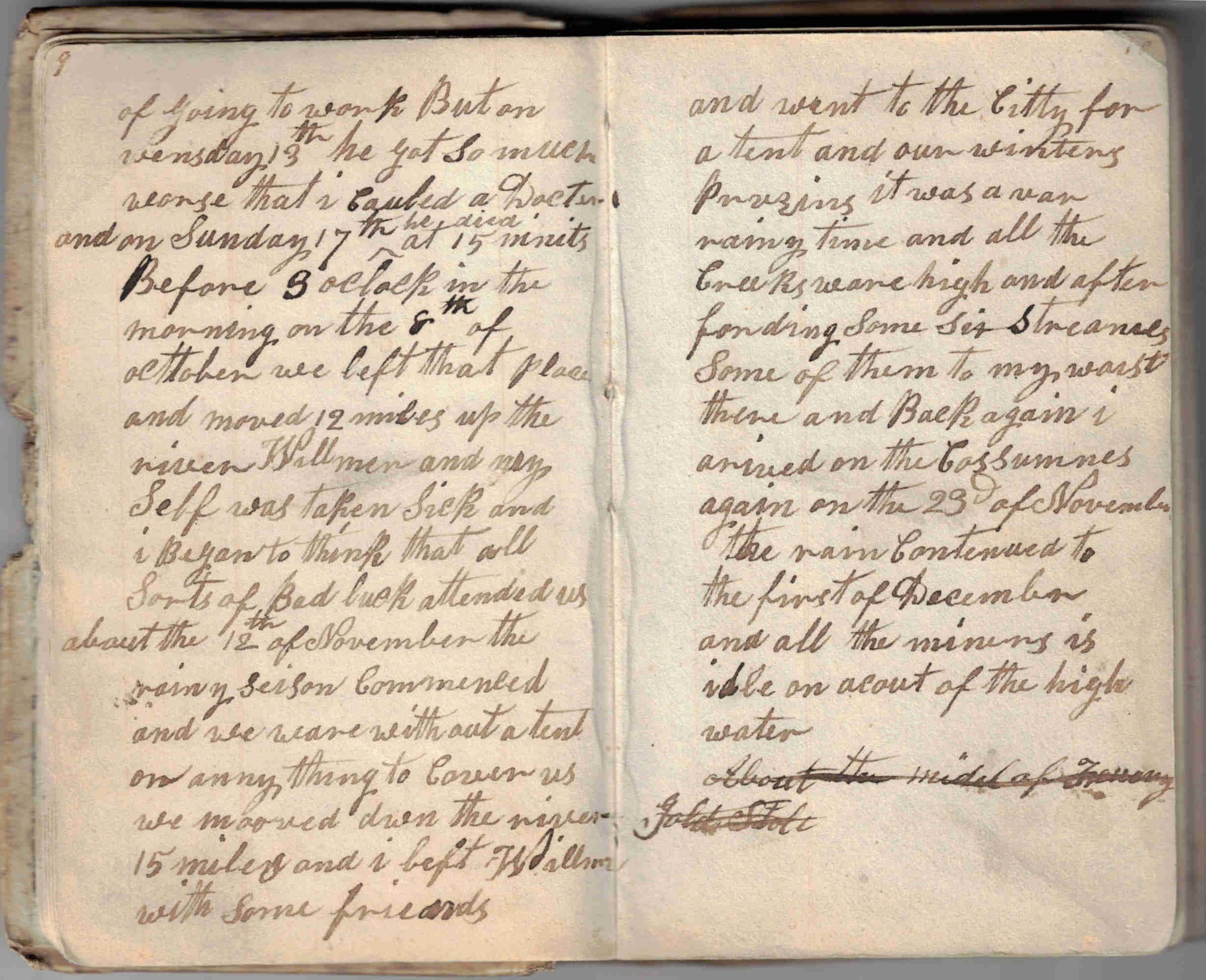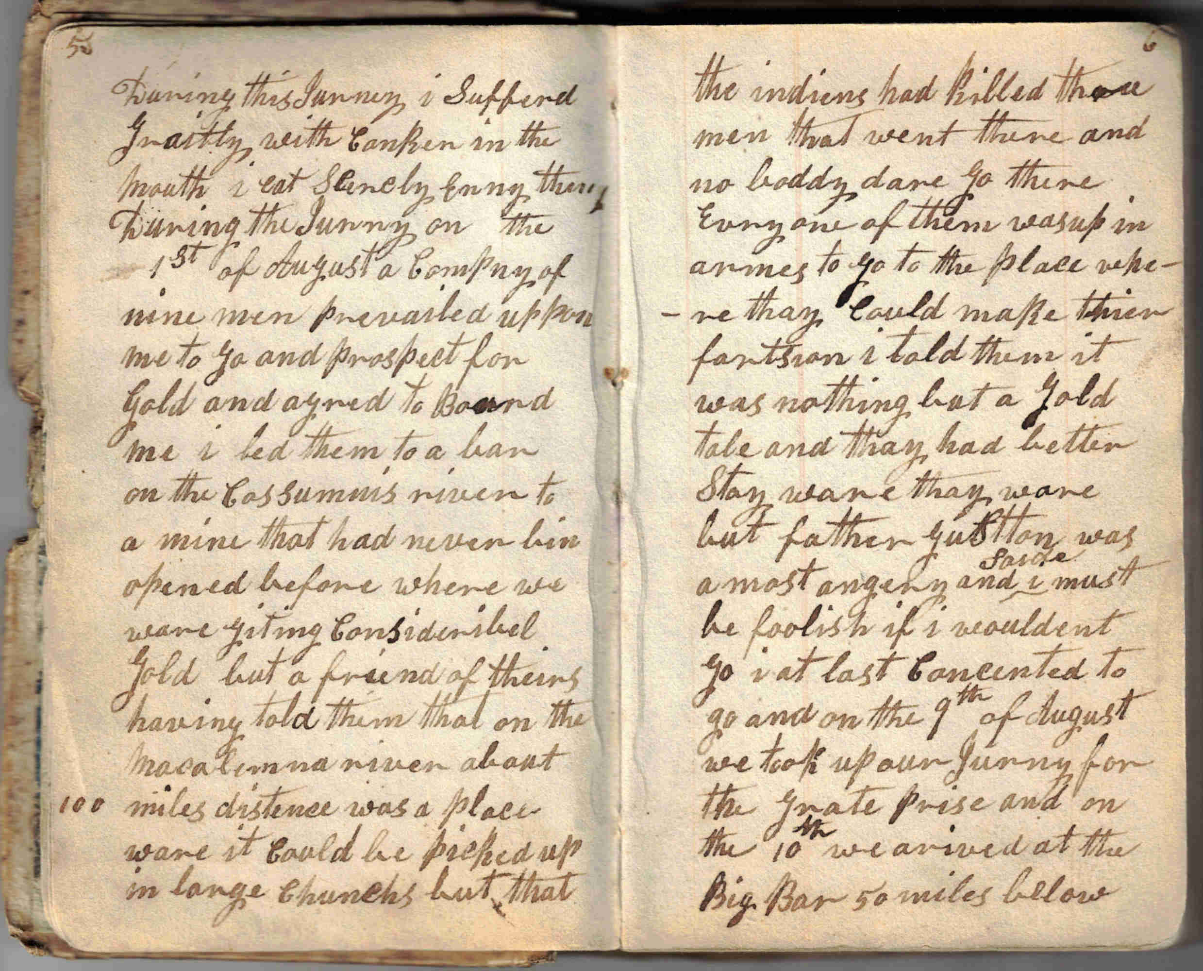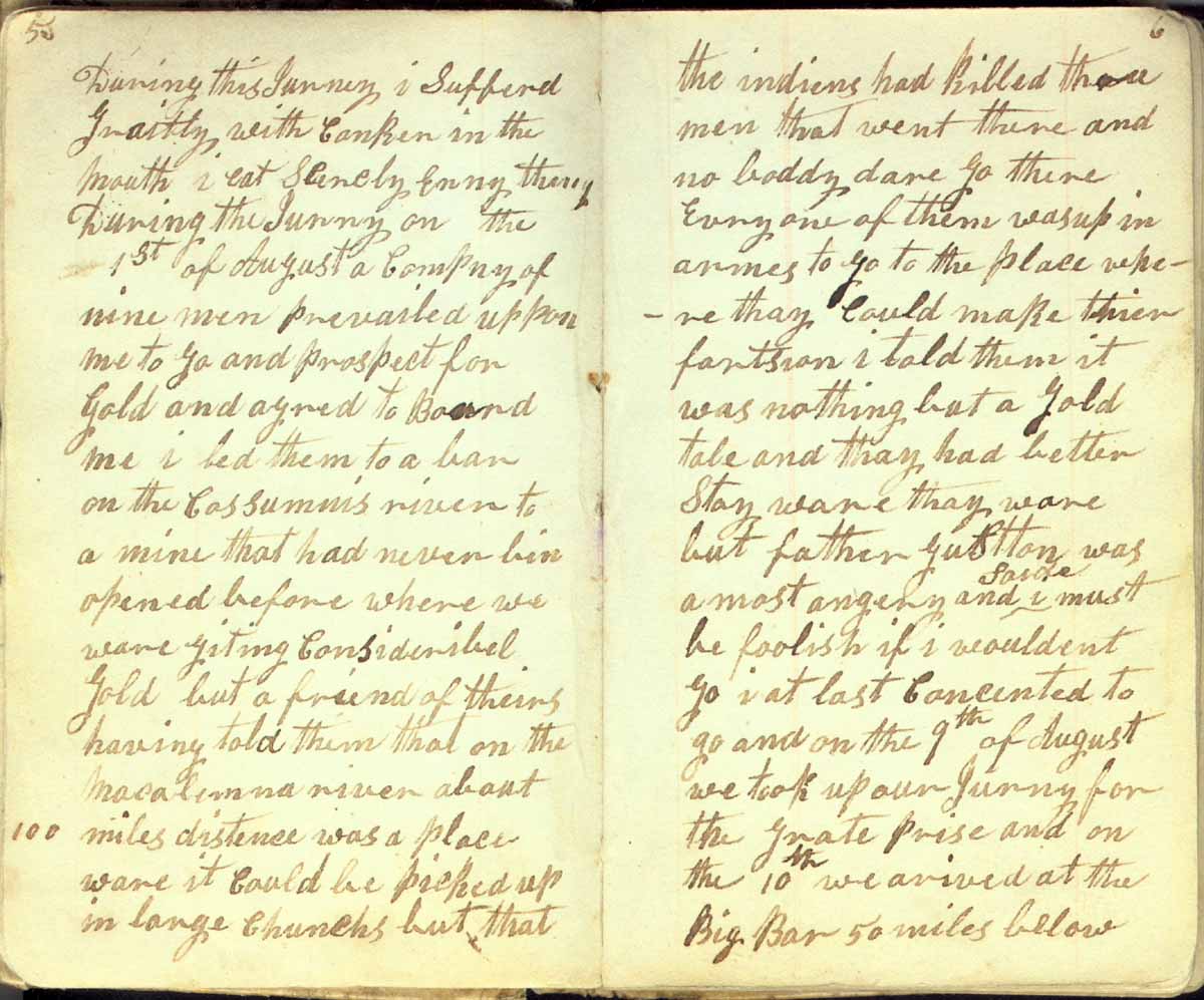 Page 5During this Journey I suffered greatly with canker in the mouth. I eat scarcely any thing during the journey. On the 1st of August a Company of nine men prevailed upon me to go and prospect for gold and agreed to board me. I led them to a ban on the Cossumnis River to a mine that had never been opened before, where we were getting considerable gold. But a friend of theirs having told them that on the Macalimna River about 100 miles distance was a place were it could be picked up in large chunks but that |
