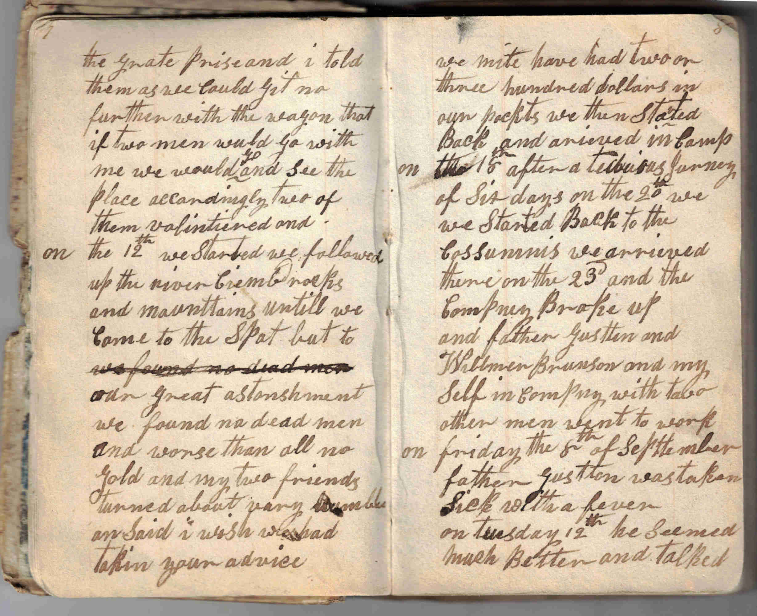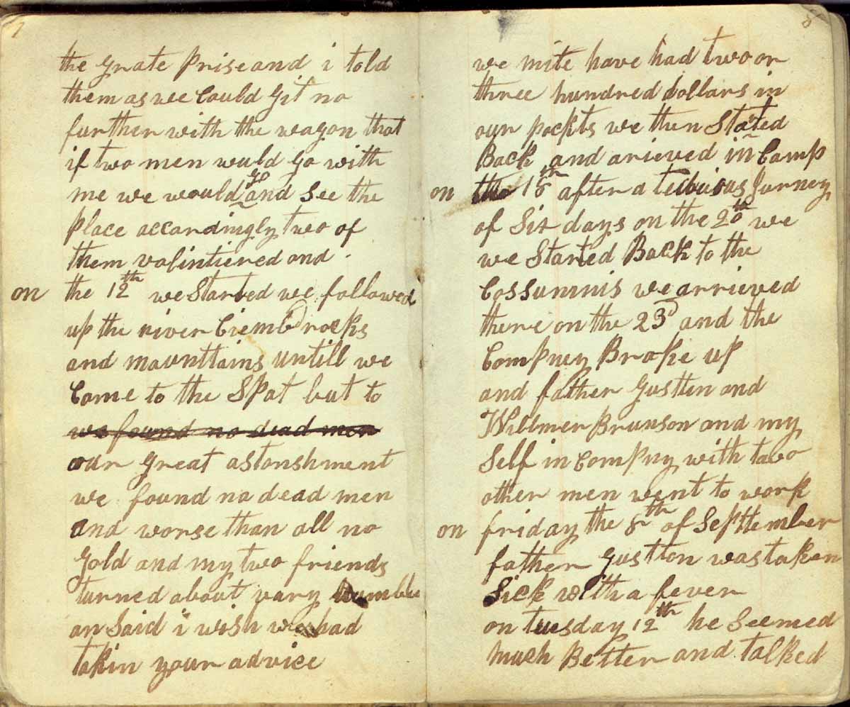 Page 8We might have had two or three hundred dollars in our [packs]. We then started back and arrived in camp on the 18th after a tedious journey of six days. On the 20th we started back to the Cossumnis. We arrived there on the 23rd and the company broke up. And father Gustin and Willmer Brunson and my self in company with two other men went to work. On Friday the 8th of September father Gustin was taken sick with a fever. On Tuesday the 12th he seemed much better and talked |