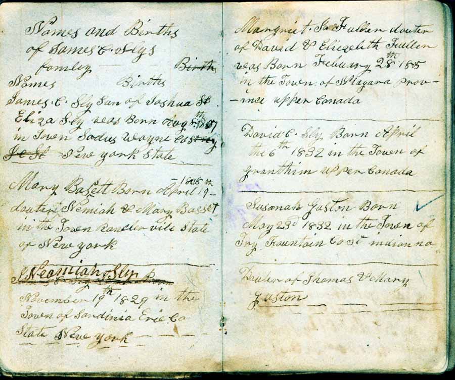 Family BirthsNames and Births of James C. Sly's Family Names & BirthsJames C. Sly son of Joshua & Eliza Sly was born Aug 8th 1807 in Town Sodus Wayne County New York State Mary Bassett Born April 19th 1808 daughter of Nemiah & Mary Basset in the Town Ranclervile State of New York Neamiah Sly Born November 19th 1829 in the Town of Sandinia, Erie Co. State New York |