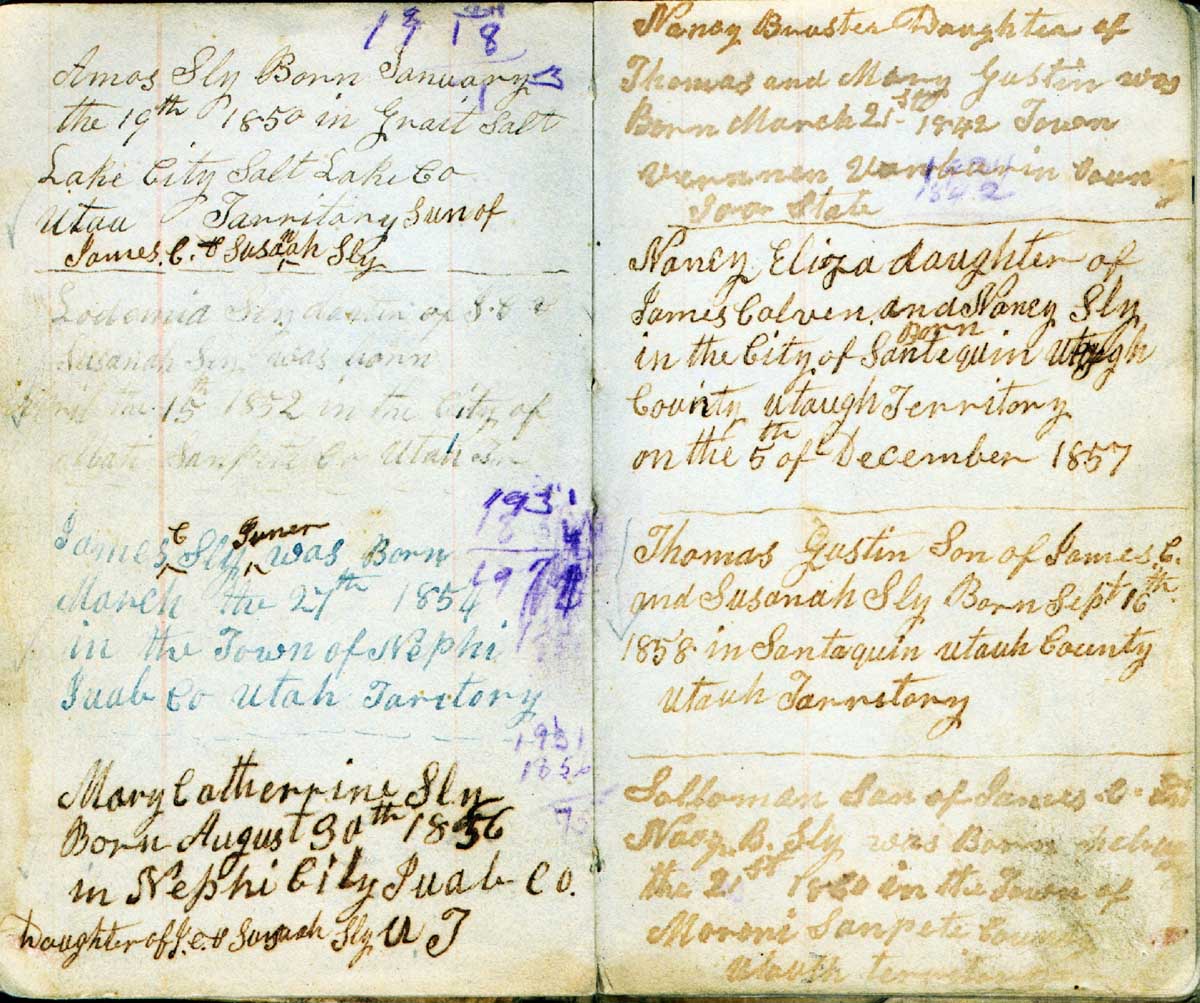 Susannah Daughter of James C. and Susannah Sly was Born March 15th 1861 In the Town of Moroni, San Pete Co., Utah Territory