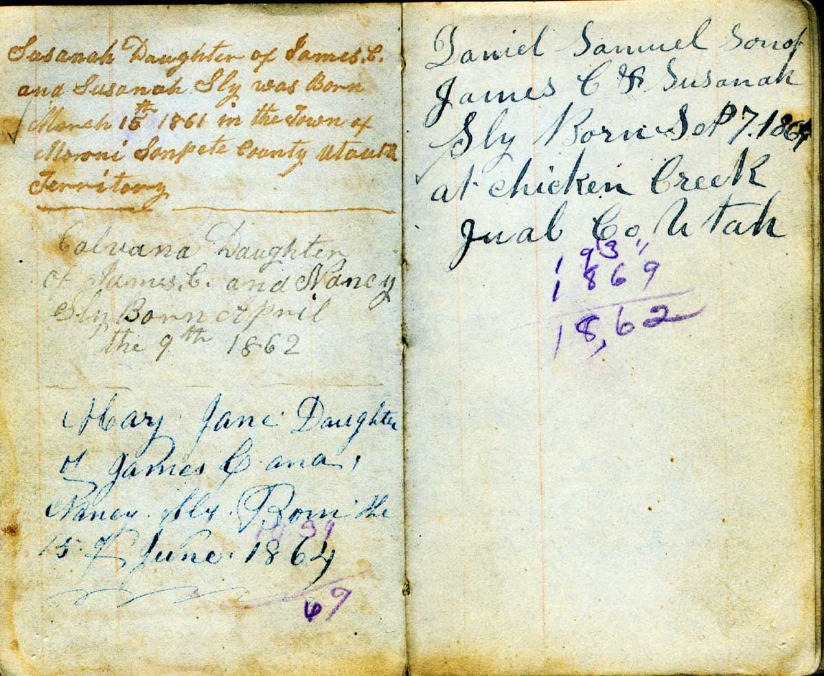 Daniel Samuel Son of James C & Susannah Sly Born Sept 7 1864 at Chicken Creek, Juab Co., Utah 193 1869 1862