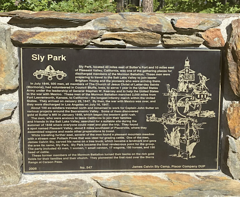 On July 2, 1848, the group of 45 men, 1 woman (a sergeant’s wife), 17 wagons, 150 horses and 150 cattle began to move up the divide between the American and Cosumnes rivers. The company stopped after a couple of days in a lush green valley, “which we called Sly’s Park after one of our men who found it, and there built a couple of corrals.” (This is taken from Bigler’s Chronicles of the West.)